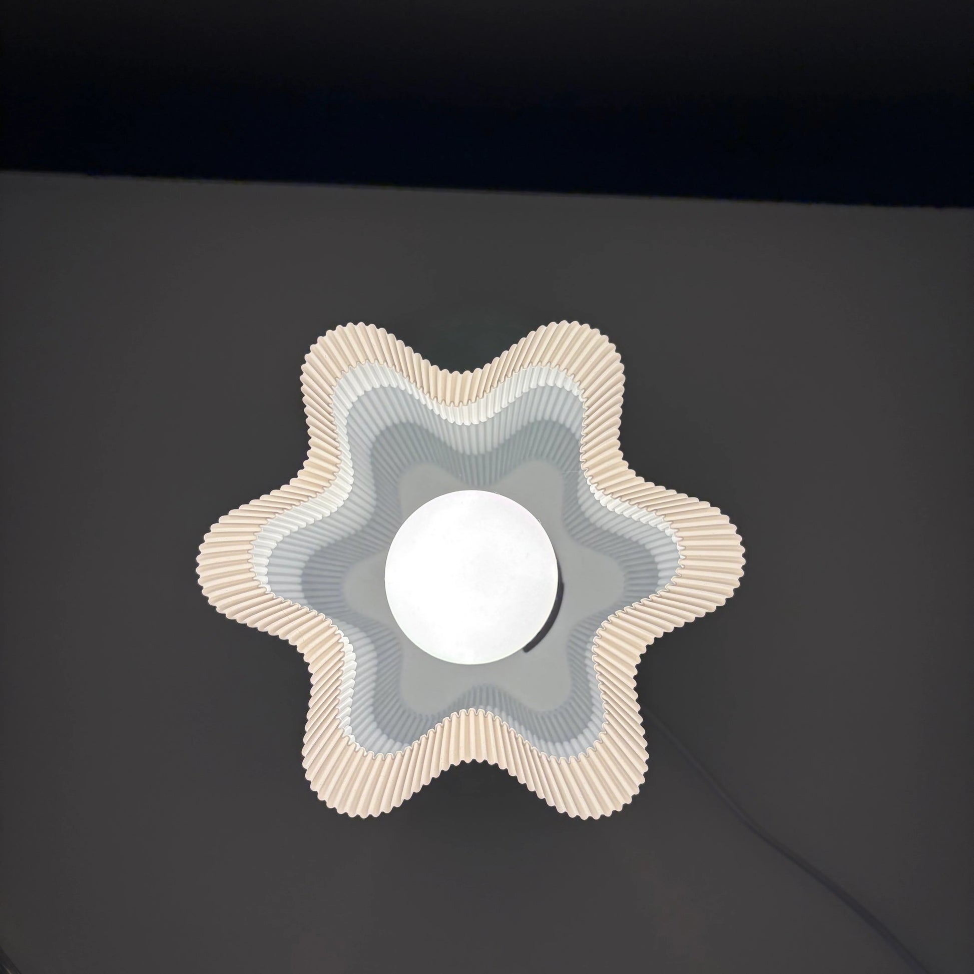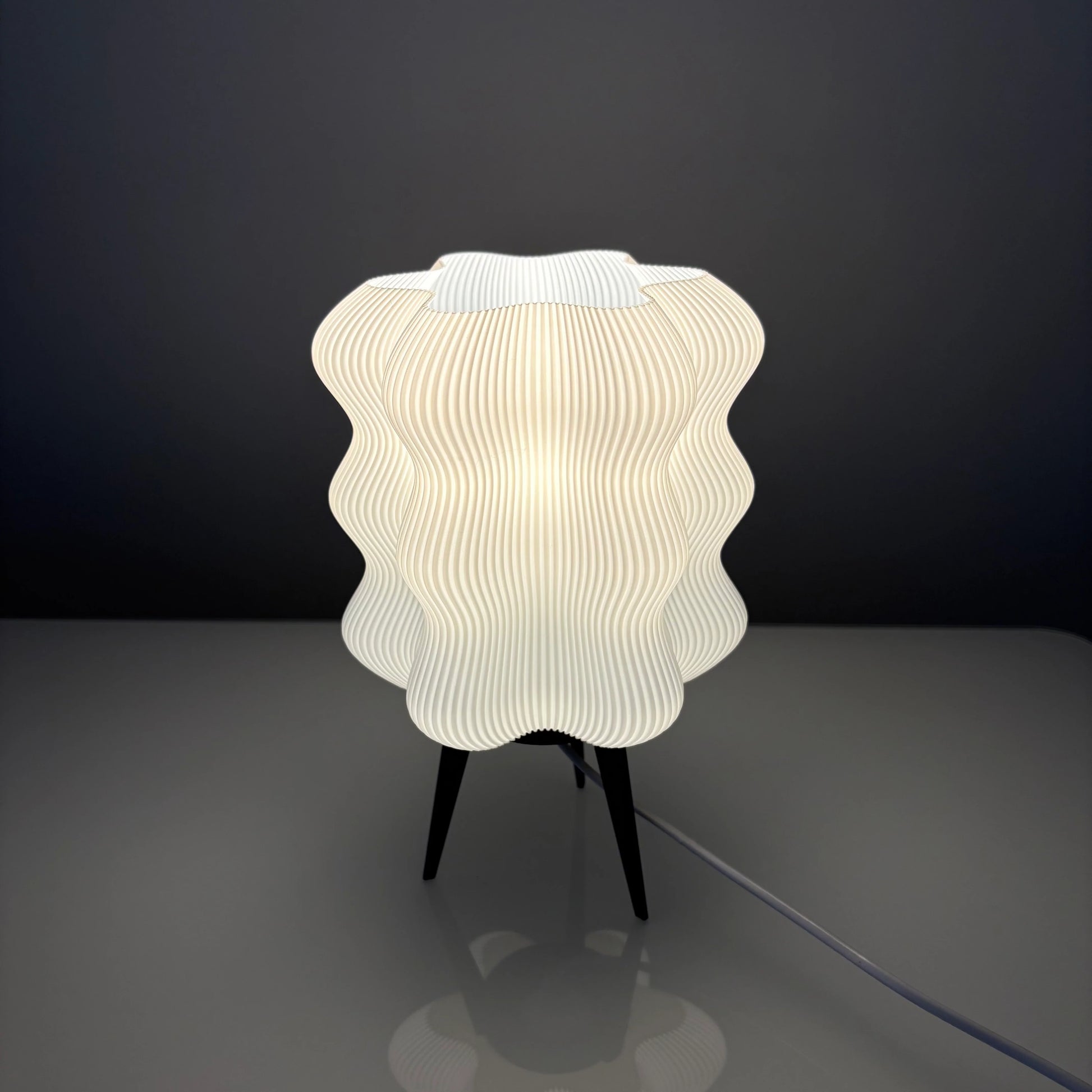 Auralis draws inspiration from the ripples of sound waves and the rhythm of nature. Its sculptural form — with gentle curves and precise symmetry — is 3D printed over 20+ hours using premium, eco-conscious bioplastic. The result is a lamp that feels alive, catching light in a way that shifts subtly with your perspective.